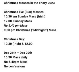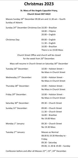 News Christmas Mass Schedules Church St and Kilkenny ByBr Martin 20 December 202320 December 2023 Church Street, Dublin 7 Capuchin Friary Kilkenny