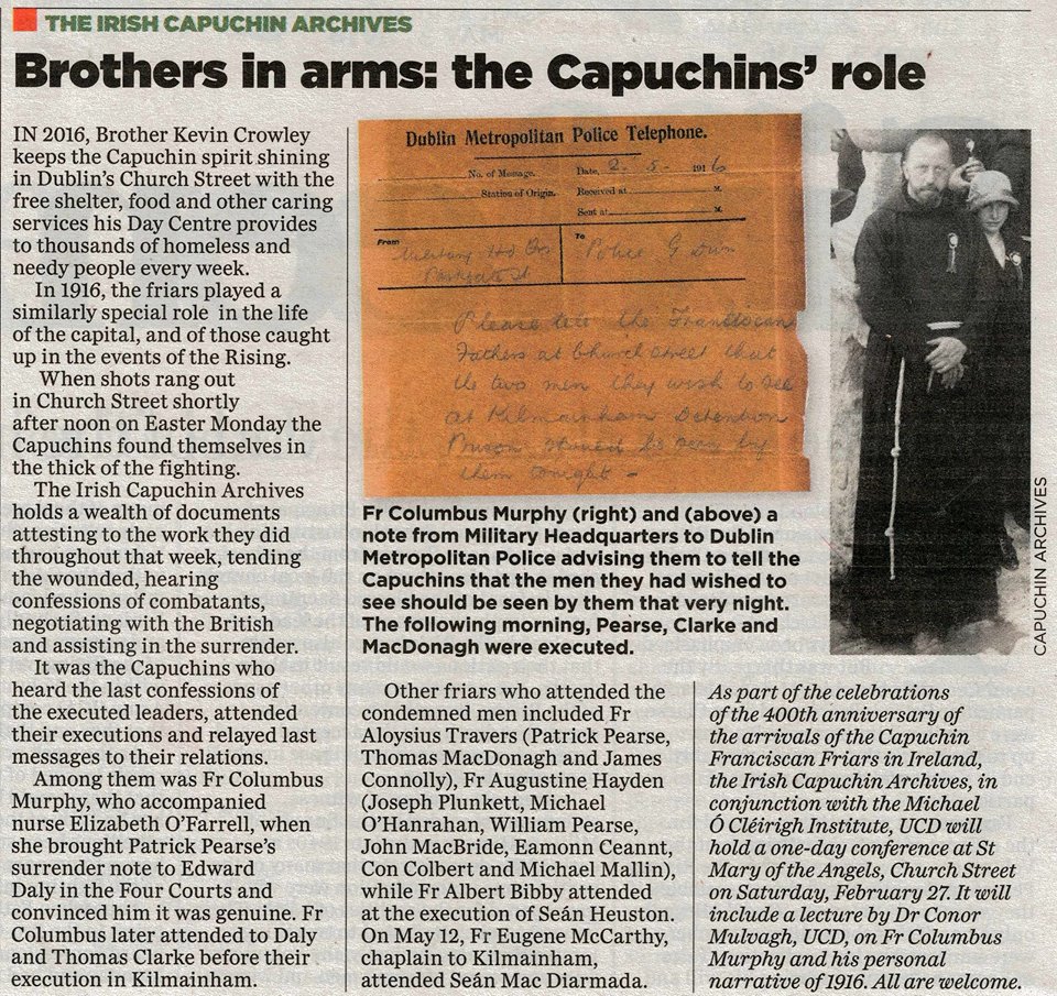 Our heritage conference celebrating 400 years of Irish Capuchin Franciscan Service, including talks on the role of the Capuchins in 1916, will take place in Church St friary on Sat. Feb 27th beginning at 10:30.