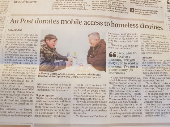 This story is covered in today’s (30 October 2109) edition of The Irish Times Newspaper. An Post plan to donate 18,000 GB of data across 2,000 SIMS cards the article reports. These cards will be distributed through a number of homeless charities. Pictured is Brother Seán Donohoe of the Capuchin Day Centre for Homeless People…