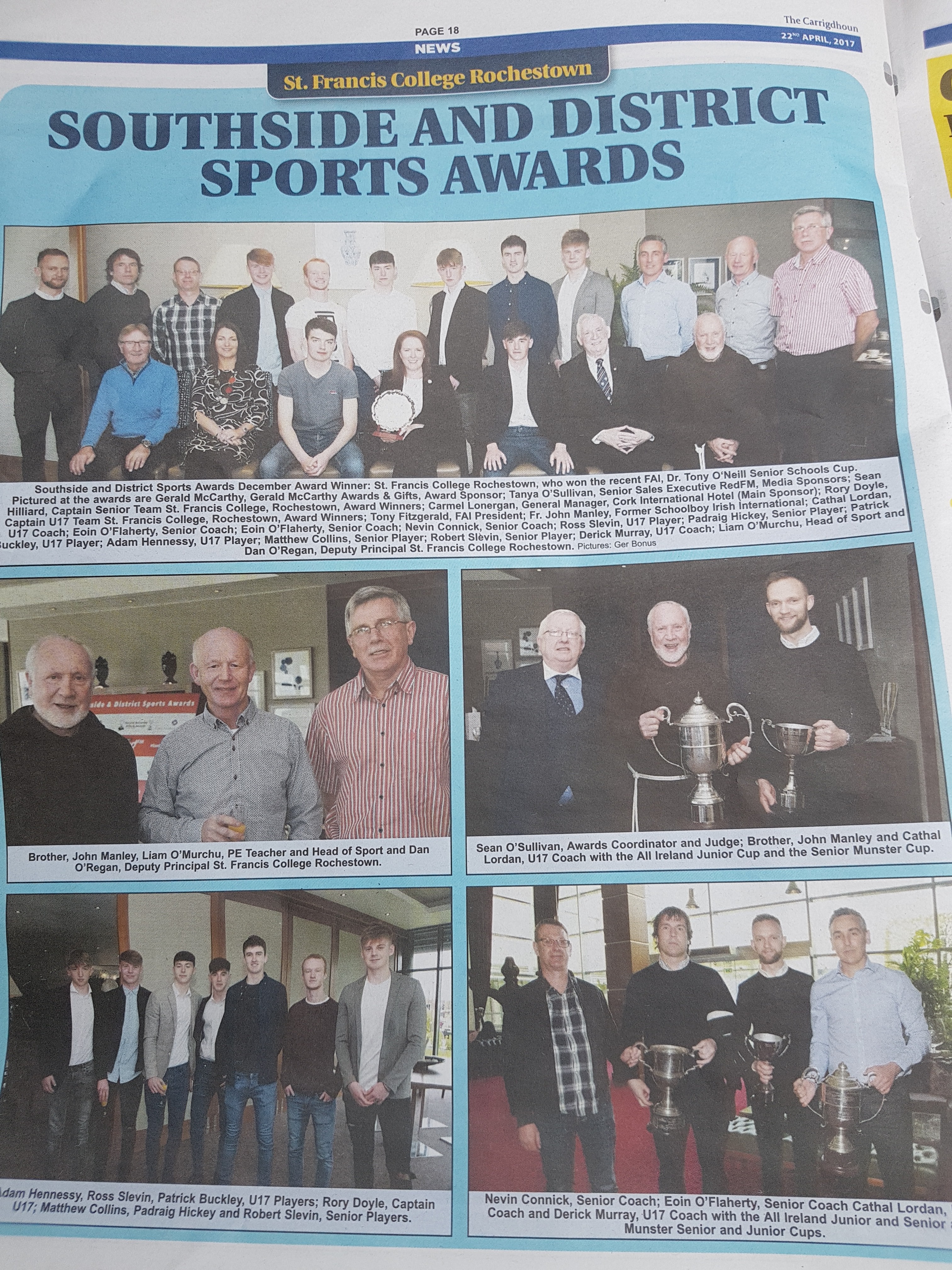 Rochestown College are the recipients of the 2017 Southside and District Sports Award in recognition of their fantastic achievements in sport. The school won All Ireland Soccer championships at both Junior and Senior level. Many congratulations to all involved.
