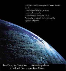 Saint Francis wrote the beautiful ‘Canticle of Brother Sun’ towards the end of his life. It took a lifetime for Francis, a great Saint, to come to fully realise the intimate connectedness of all creation. We, as children of the God who created all we see and know, are called to care for this creation. To be good stewards who promote well-being for all of God’s creatures. In a throw-away global culture driven by excess and the need to consume, this message holds particular significance and value. It is a call to live in balance and harmony, a call to live with awareness and sensitivity, a call to speak out in favour of the protection of God’s creation. We are called to live in such a way that we facilitate, promote and support the on-going creativity of the Trinity in our world and in each other.